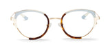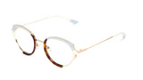 Gafa ovalada que destaca por la combinación de acetatos laminados con un contorno y estructura metálicos.