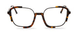 Montura cuadrada metálica con apliques en acetato tanto en el puente como en los dos extremos superiores, jugando con las contraposiciones y los cambios de volumen.