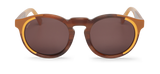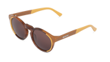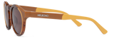 Gafas de montura redondeada en tonos marrón y caramelo con detalles en amarillo. Su diseño combina líneas suaves con un toque moderno, creando un estilo original y versátil.