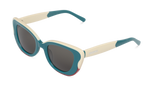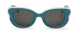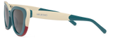 Gafas de sol estilo cat-eye con montura en azul petróleo, crema y detalles rojos. Su diseño audaz y los lentes oscuros combinan un toque retro con una vibra moderna y original.