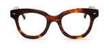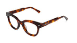 Montura robusta y contundente con un toque cat-eye suave y curvado y una varilla aristada que realza su figura.
