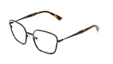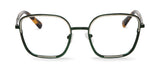 Gafa cuadrada y de líneas sencillas, con matices de color y varillas de acetato tipo pincel.