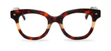 Montura robusta y contundente con un toque cat-eye suave y curvado y una varilla aristada que realza su figura.
