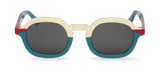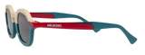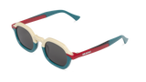 Las líneas curvas se armonizan en esta montura en azul petróleo, crema y detalles rojos. para dar lugar a unas gafas de sol con personalidad de formas ovaladas y con presencia.